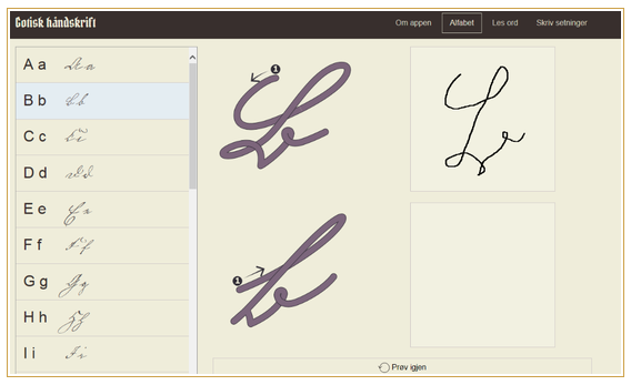 I appen får du hjelp til å lese og forstå gotisk handskrift, og du kan sjølv prøve å skrive bokstavar, slik du ser i dømet over. Du finn appen på http://gotiskhaandskrift.arkivverket.no.