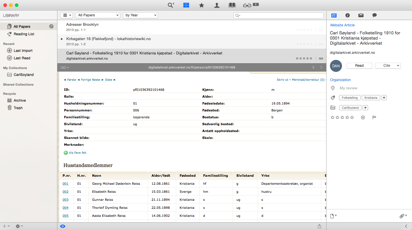 Du kan legge inn flere opplysninger om dokumentet. Klikker du på ”i” i høyre kolonne, vil du under ”Published” kunne legge inn en dato for når dokumentet ble opprettet. Det kan være en ide å endre denne datoen til det opprinnelige dokumentets dato – f. eks. at du legger inn en folketelling fra 1910, og gir denne datoen 01.12.1910, og ikke dagens dato. Denne metoden vil gi deg en kronologisk oversikt over dokumentene dine.